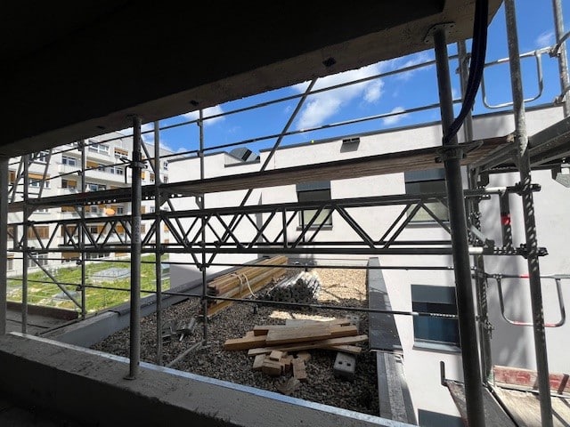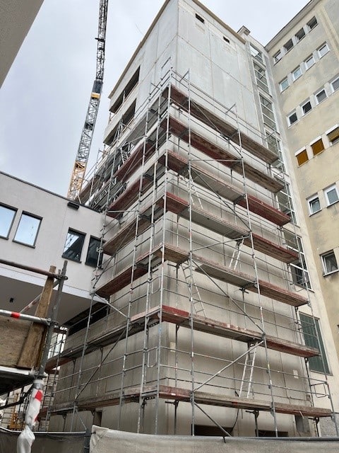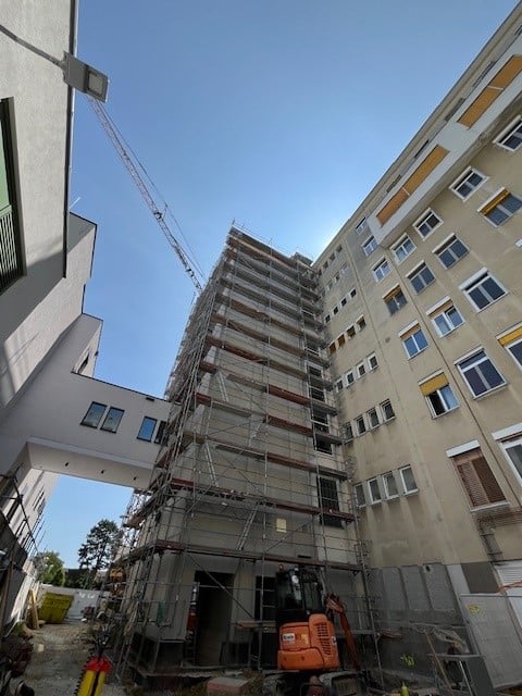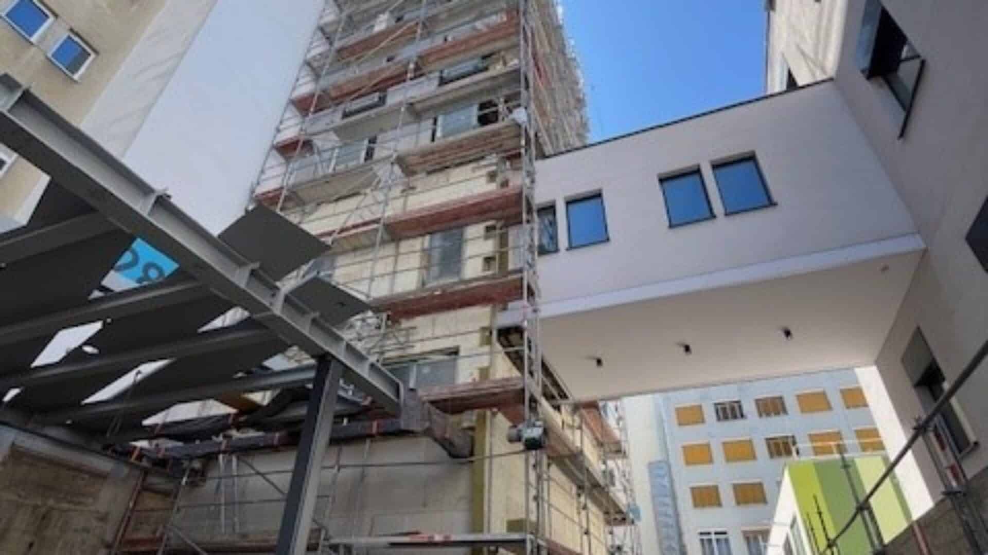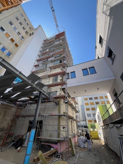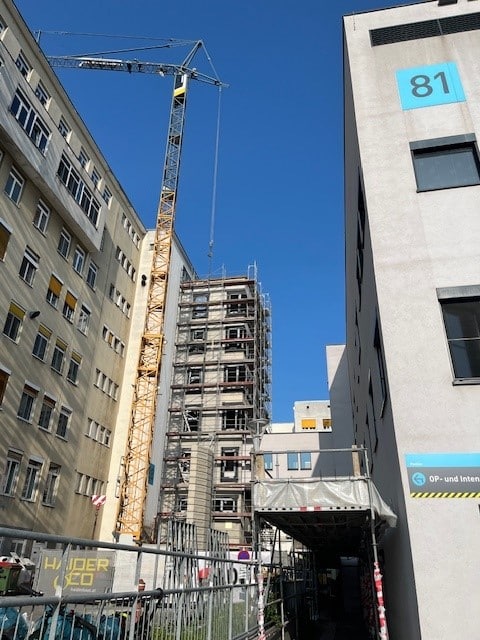 In Wien Ottakring errichten wir als Baumeister einen siebengeschossigen Aufzugszubau in Fertigteilbauweise. Die Anbindung erfolgt an das bestehende Gebäude Pavillon 28, sowie an eine Bestandsbrücke, die bis zur Hälfte abgebrochen und anschließend in den Zubau integriert wird. Besondere bautechnische Herausforderungen ergaben sich durch den alternativen Rückbau der Bestandsbrücke, die während der Rohbauphase durch die Fertigteile umhüllt und erst im Anschluss selektiv abgetragen wurde. Um den sicheren Klinikbetrieb zu gewährleisten, wurde während des Brückenabbruchs eine alternative Verbindung für den Patiententransport außerhalb des Gebäudes eingerichtet. Trotz komplexer Bestandssituation und engem Zeitplan, konnte die Gebäudehülle plangemäß errichtet und der Rohbau mit Mai 2025 abgeschlossen werden.