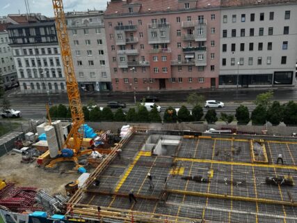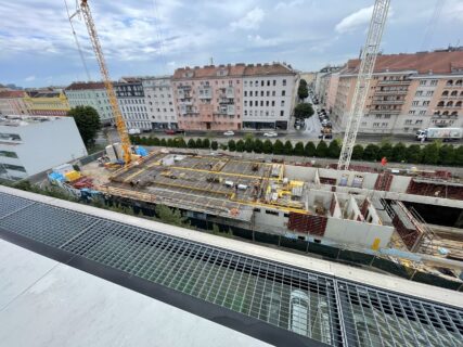 Am gegenständlichen BVH sind wir seitens WIGEV mit der Errichtung eines 4-geschossigen Laborgebäudes (UG, EG + 2 OG) am Geländer der Klinik Favoriten beauftragt. Der Werkvertrag umfasst die Errichtung des Rohbaues (inkl. Baugrubensicherung und Aushub), sowie der Außenhülle (Gründachaufbau, Fenster, Alu-Verbund Fassade, sowie Holzfassade). Besondere Herausforderungen stellen der knappe Terminplan (Rohbauzeit ca. 6 Monate), sowie die beengten Platzverhältnisse dar. Das Untergeschoss wird nach Richtlinie Weißer Wanne errichtet.